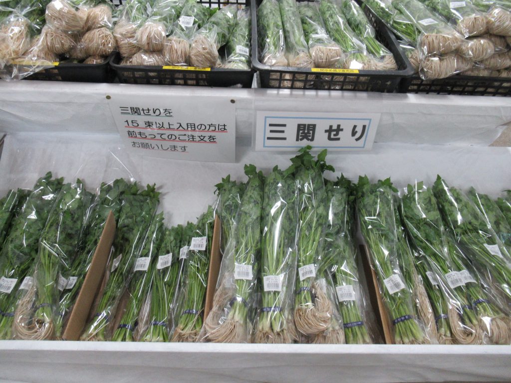 三関地区の伝統野菜「三関せり」の本格的な収穫が始まり、三関ゆめ蔵ぶ直売所でも入口すぐの売り場で販売中!「三関せり」は、葉はもちろん、白く長く伸びた根まで大変おいしく食べられ、独特の風味で程よく、しゃきしゃきとした歯触り感が特徴です。きりたんぽ鍋はもちろん、天ぷらやきんぴら、ナムルにもどうぞ。三関ゆめ蔵ぶ直売所ではせりを使ったレシピも配布しています。なお、15束以上お求めの方は、事前にご注文の上ご来店ください。