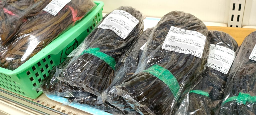 また、この時期は冬の保存食として重宝される「塩蔵品」(ワラビなどの山菜やキュウリなど)も販売されています。塩抜きのやり方は店内のPOPに掲載されていたり、店員さんに聞いても教えてくれます。塩蔵品は生野菜の少なくなる冬期間を通して随時販売するとのことです。