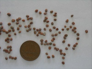 とても小さな種です。この種を機械で1カ所3~4粒播きます。品種は、「あきたおにしぼり」です。 (6月11日)