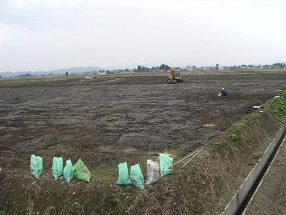 完成したほ場(田んぼ)の全景です。施工期間は平成22年4月16日から23日までの8日間(実施工は5日程度)です。
