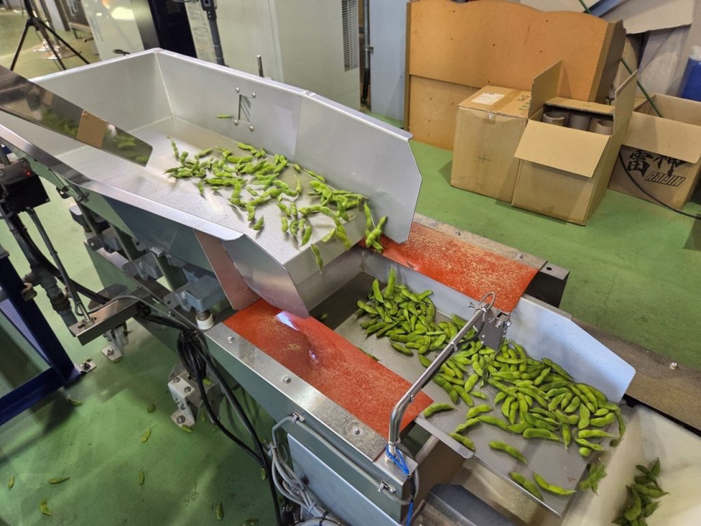 大規模に栽培を行っている経営体では、専用の選別機を使って選別します。写真の機械では一日に2tのえだまめを選別することができます。