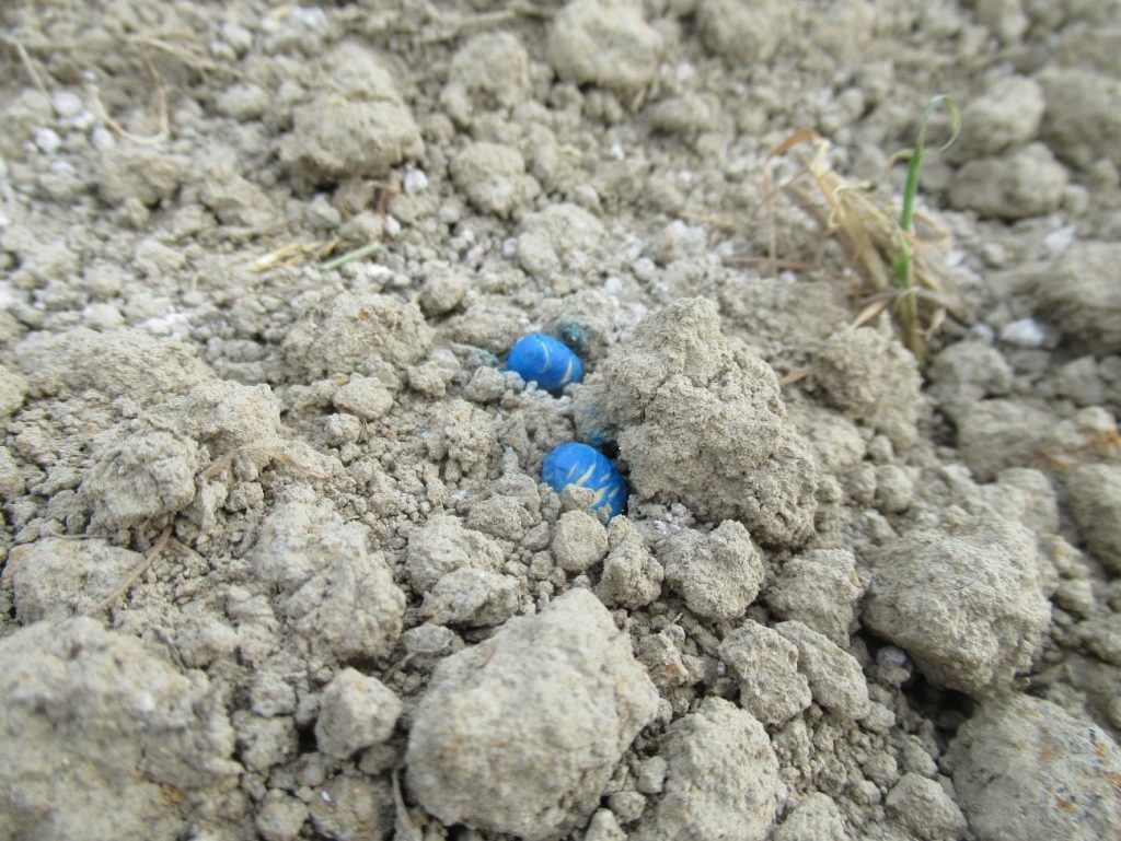 播種後すぐの種は鳥や虫に狙われやすいほか、立枯病などの病気のリスクもあります。食害や病気から種を守るため、えだまめの種は薬剤でコーティングされています。薬剤がかかっていることを分かりやすくするために、種は青く着色されています。