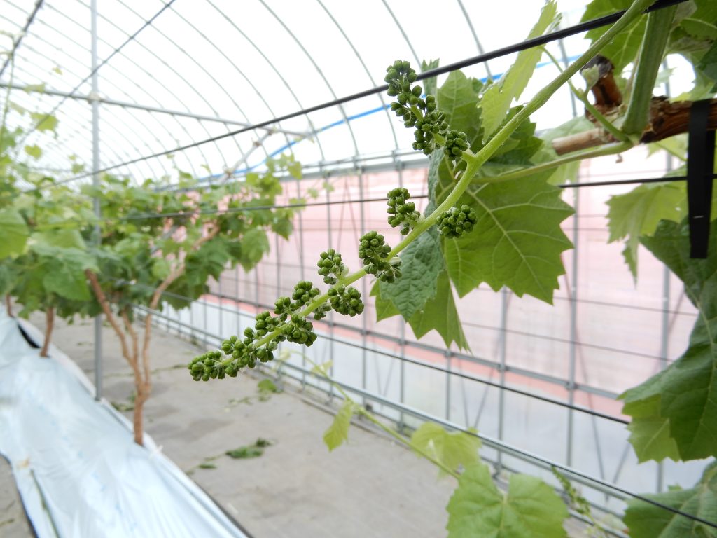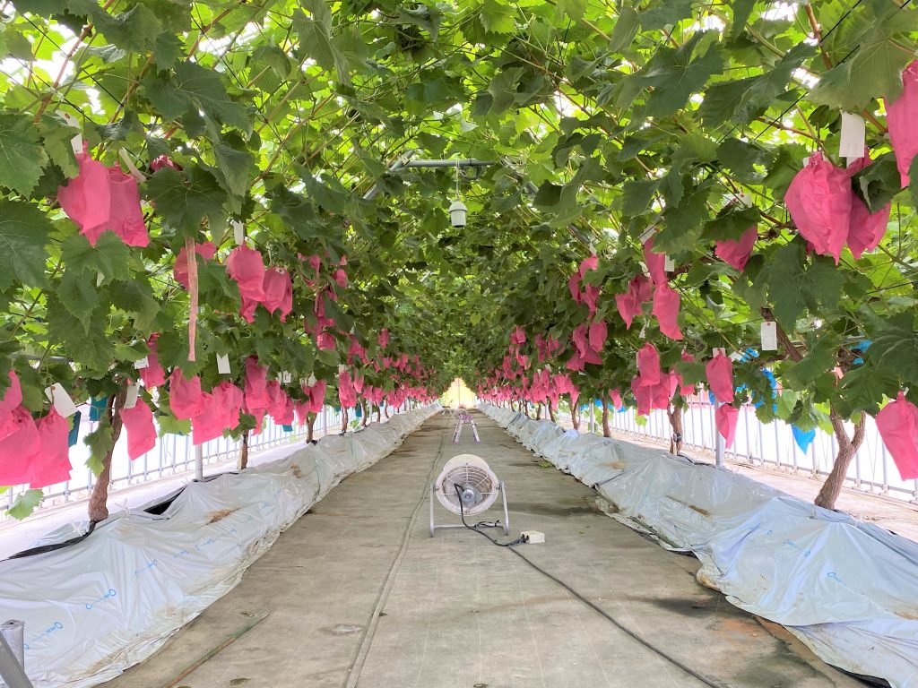 県内におけるぶどう栽培は、地面に苗を植え、そこから伸びた枝や房の上のみをビニールで覆う露地(ろじ)栽培が一般的です。