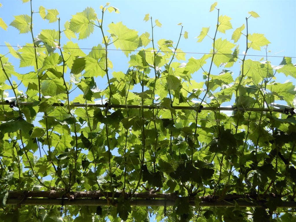 春になると、芽が出て新梢(しんしょう)と呼ばれる若い枝が伸びてきます。このうち、不要な枝を取り除き、枝同士が重ならないように配置することで、日当たりを良くします。また、それぞれの新梢が伸びすぎないよう、ある程度の長さまで達したら先端を切り落とします。いずれも地味で細かい作業ですが、品質の高いぶどうを作るためには非常に重要な作業です。