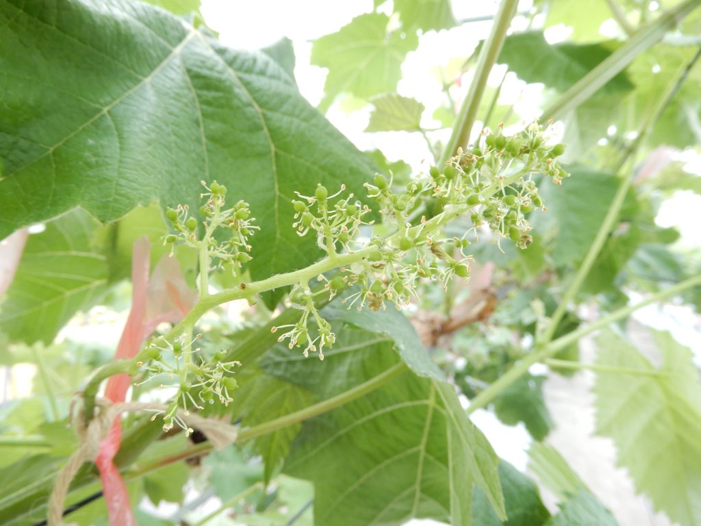 新梢がある程度まで伸びると、房の基になる花穂(かすい)が現れるので、不要なつぼみを取り除きます。整形する前の花穂は、写真のように縦長で15cmほどですが、このうち先端の4cmのみを残し、それ以外のつぼみはすべて手やハサミで取り除きます。