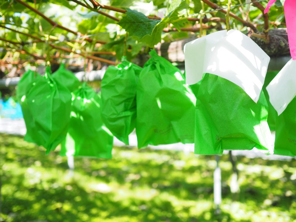 摘粒が終わったら、房に袋をかけていきます。袋には、病気や害虫、直射日光から房を守る役割があります。それぞれの粒は、袋をかけた後も収穫まで大きくなることから、時折、袋を外して粒同士が押し合っていないか確認しつつ、じっくりと収穫を待ちます。